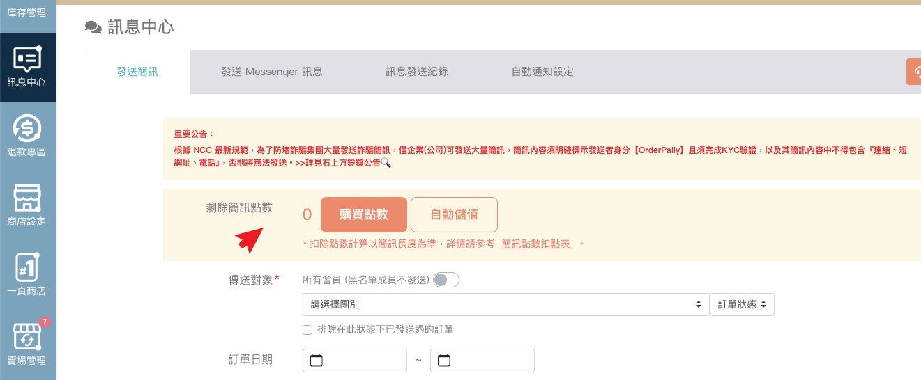 根據 NCC 最新規範,為了防堵詐騙集團大量發送詐騙簡訊,僅企業(公司)可發送大量簡訊,簡訊內容須明確標示發送者身分【OrderPally】且須完成KYC驗證,以及其簡訊內容中不得包含『連結、短網址、電話』,否則將無法發送。>>詳見系統右上方鈴鐺公告🔍